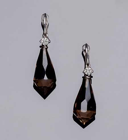 Pendientes zarcillo en oro blanco con un limpio y blanco diamante, talla brillante, en garras, y una lágrima facetada colgante de cuarzo fummé. Peso 2 btes: 0.20 ct aprox. (Características estimadas: color H, pureza, VS) 33 mm.