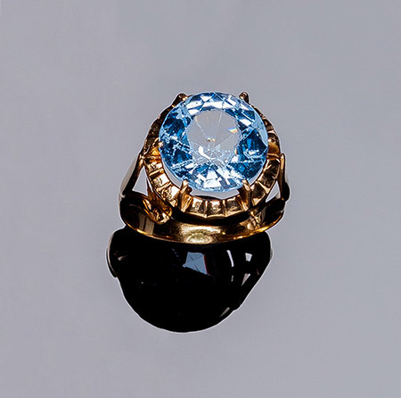 Sortija vintage en oro amarillo con piedra azul talla brillante, en garras de ilusión. Nº de anillero: 13.