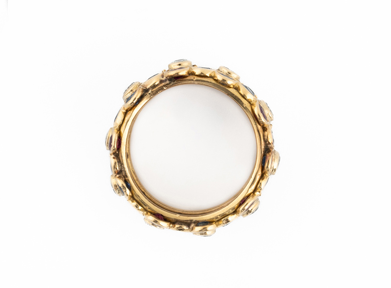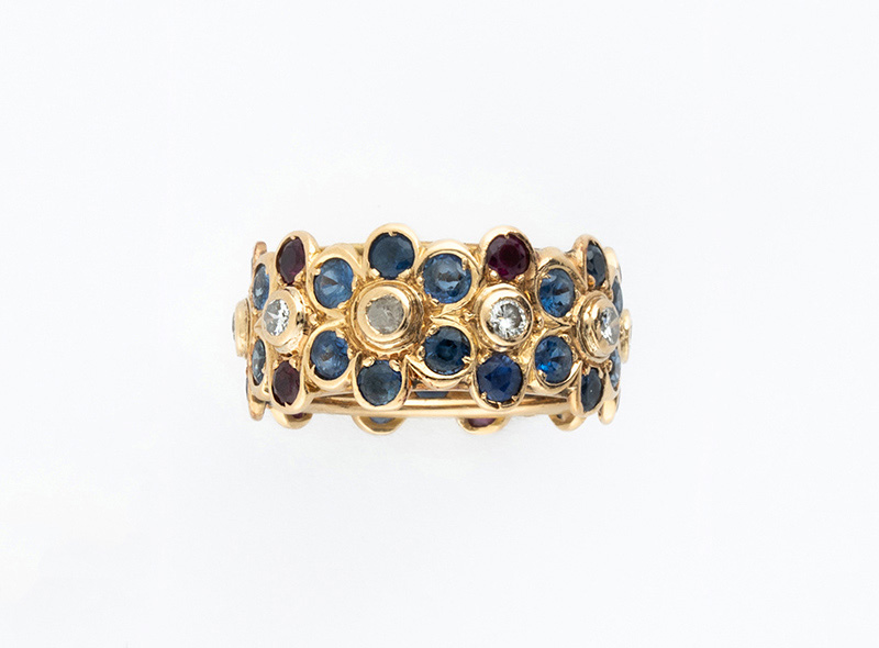 Sortija ancha en sólida montura de oro amarillo 18 K con motivo de greca floral completa, con centros de brillantes orlados de zafiros finos azules y rubíes intercalados, en chatón (10 btes: 0.50 ct aprox., características estimadas: color H, pureza VS - uno lascado). Nº anillero: 12-13.